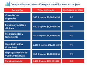 De acuerdo con datos de la Asociación Internacional de Seguros de Viaje (ITIA, por sus siglas en inglés), el 35 % de las reclamaciones en el extranjero están relacionadas con atenciones médicas imprevistas. En países europeos, donde el sistema de salud es costoso para los no residentes, un simple accidente o enfermedad puede convertirse en una carga financiera considerable.